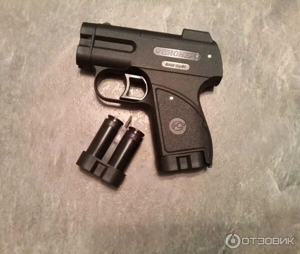Аэрозольный пистолет «Пионер» внешне напоминает обычный боевой пистолет, однако устроен совсем иначе. Он предназначен для отстрела специальных аэрозольных патронов, которые заряжаются в специальную обойму, вставляющуюся в дело. В этом, на мой взгляд, заключается главный минус данного средства самообороны: всего два патрона, после отстрела которых необходимо доставать и перезаряжать обойму. В то время как у других аэрозольных пистолетов - того же "Добрыни", например, существует возможность произвести сразу 5 выстрелов подряд, без перезарядки.