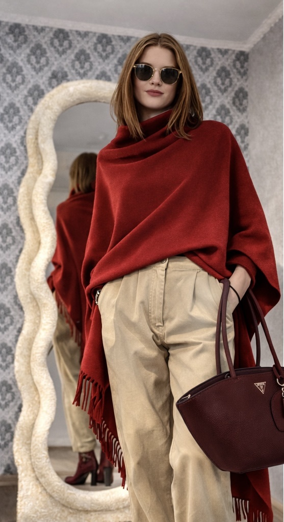 Центром композиции становится пончо в сложном винном оттенке. Это глубокий бордовый с тёплым подтоном, без излишней алой яркости. Цвет выглядит насыщенным, но не агрессивным — он словно «приглушён бархатом», что добавляет ему статуса.