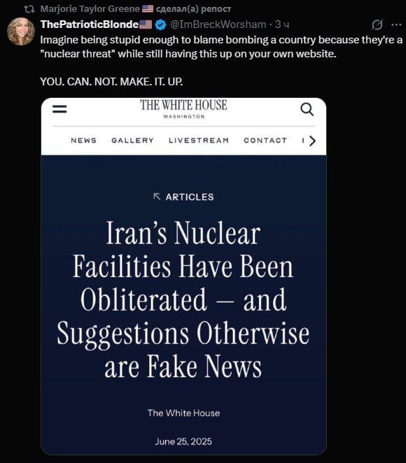 весь ядерный потенциал Ирана уничтожен ударами. Бывший соратник Трампа республиканец Марджори Тейлор Грин задает опасные вопросы в Х. 😏 Брекотин. Подписаться 🇷🇺 Брекотин в MAX