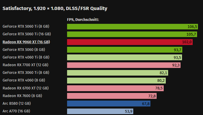 • AMD Radeon RX 9060 XT с 16 ГБ GDDR6. Это примерно одинаковые по цене карты для большинства игроков в 1080p и 1440p. В реальных тестах Radeon RX 9060 XT показывает в среднем на 15–20% больше FPS, чем RTX 5060 в популярных играх. При этом RX 9060 XT часто выигрывает не только в чистом FPS, но и в стабильности кадров, особенно там, где объем видеопамяти становится важным. Больший объем памяти дает преимущество в тяжелых уровнях. На практике это означает следующее. Если RTX 5060 дает 70–90 FPS в 1440p без трассировки, RX 9060 XT ча