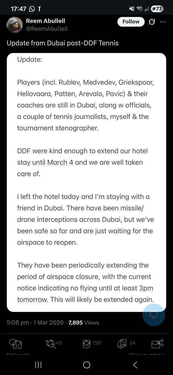 : В Дубае остаются игроки (включая Рублева, Медведева, Грикспора, Хелиоваара, Паттена, Аревало, Павича) и их тренеры, а также официальные лица, несколько теннисных журналистов и стенографист турнира. DDF любезно продлили наше пребывание в отеле до 4 марта, и о нас хорошо заботятся. Были перехваты ракет/дронов над Дубаем, но мы в безопасности и просто ждем открытия воздушного пространства. Подпишись на Эйс и точка