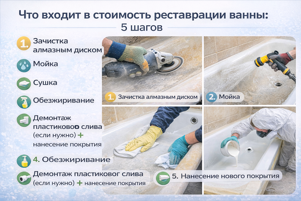 Показываю по шагам — что входит в стоимость реставрации ванны (Москва и МО). Снимаем всё лишнее и готовим поверхность так, чтобы новое покрытие сцепилось с ванной.