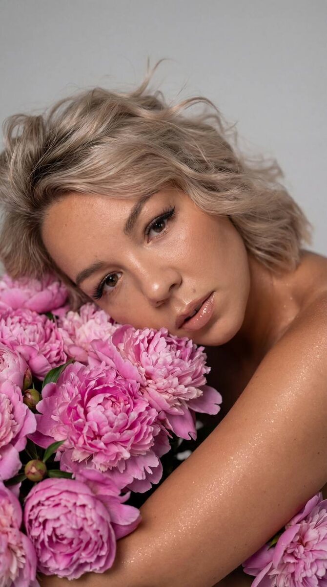 👇🏻 🌟Переходим на удобный сервис для генерации: Ссылка 👉 Syntx Ai Ссылка 👉 Veo3 📌ИНСТРУКЦИЯ ПО ИСПОЛЬЗОВАНИЮ В ЗАКРЕПЛЕННЫХ СООБЩЕНИЯХ ◾️ПРОМТ : Не меняй черты лица Крупный план молодой женщины с слегка растрёпанными волосами , объемные красивые , которая лежит на боку, прижавшись к обильному, яркому букету цветущих розовых пионов. Ракурс немного сверху, взгляд модели направлен прямо в камеру. Мягкий, рассеянный студийный свет нежно подчёркивает влажный блеск её губ на которые нанесён нюдовый блеск, и загар. На теле много блестящего шиммера , на глазах стрелки и пышные длинные реснички с уголками как у лисички. Фон однотонный, светло-серый Глубина резкости очень мала: глаза женщины и ближайшие цветы идеально чёткие, в то время как задний план и некоторые дальние части букета мягко размыты что усиливает ощущение интимности и изолирует объект съёмки, придавая кадру мечтательное, художественное качество. Общее настроение — чувственное, уязвимое, элегантное и свежее, напомин