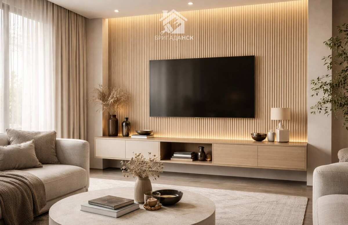 Телевизор в проекте, по факту, просто чёрный экран. А вот то, что за ним, задаёт весь стиль гостиной👇🏼 Бамбуковые панели — тёплая живая фактура, добавляет глубину и уют. Керамогранит под камень — современно и монолитно, особенно хорошо смотрится в больших пространствах. Декоративная штукатурка — лёгкий рельеф, который красиво работает при боковой подсветке. Акцентные обои — рисунок или текстура без сложных конструкций, если хочется выразительности. Гипсовые 3D-панели — объём и игра света, особенно эффектно вечером. Фреска или художественная роспись — решение для тех, кто хочет интерьер с характером. Стена-скала или выраженный фактурный бетон — смело, брутально и очень эффектно. Молдинги с покраской — аккуратная геометрия, когда багеты формируют рамки и вся стена окрашена в один оттенок. Комбинация открытых полок и закрытых модулей — телевизор становится частью композиции, а не просто экраном на стене. Подсветка по периметру или за панелью — мягкий вечерний сценарий, который добавляет