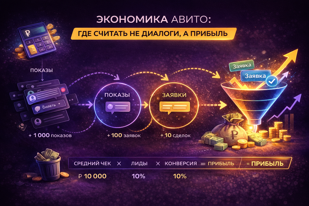 – сколько заявок Если цифры растут – значит, всё хорошо, но по опыту Andreev Digital, диалоги не равны деньгам. Именно поэтому у многих создаётся ощущение: «Лидов много, а прибыли нет». Разберёмся, как правильно считать экономику Авито, чтобы управлять не переписками, а результатом. Допустим: Вопрос: хорошие ли это показатели? Пока вы не знаете: оценить эффективность невозможно. Диалоги – это только верх воронки. Чтобы понимать прибыль, нужно считать 5 ключевых показателей. Сколько вы тратите на: И делите на количество диалогов. Например: 30 000 ₽ бюджета → 100 диалогов.