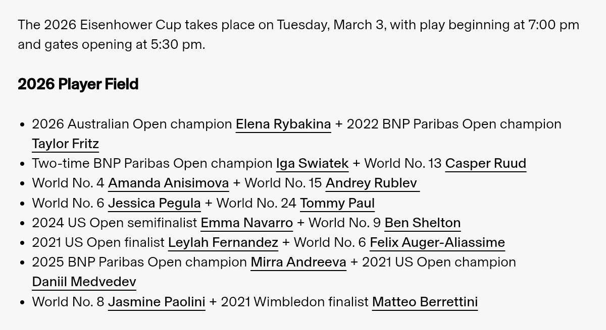 ? 🤔 В 2026 году в Eisenhower Cup сыграют: 🎾 Елена Рыбакина и Тейлор Фриц 🎾 Ига Швентек и Каспер Рууд 🎾 Аманда Анисимова и Андрей Рублев 🎾 Джессика Пегула и Томми Пол 🎾 Эмма Наварро и Бен Шелтон 🎾 Лейла Фернандес и Феликс Оже-Альяссим 🎾 Мирра Андреева и Даниил Медведев 🎾 Жасмин Паолини и Маттео Берреттини Подпишись на Эйс и точка