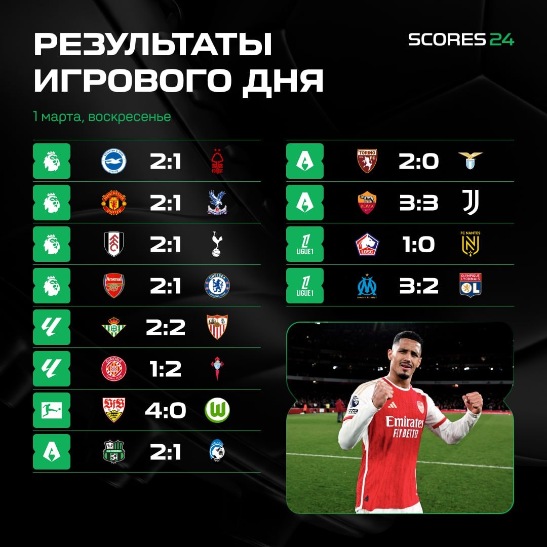 ❤️ 1️⃣ «Арсенал» справился с «Челси» в лондонском дерби 🔝 2️⃣ «Ювентус» вырвал ничью на последних минутах в безумном матче против «Ромы»🔥 3️⃣ «Марсель» добыл победу в концовке противостояния с «Лионом» усилиями Обамеянга ⚡️
