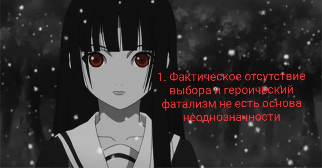 Чтобы объяснить эту дилемму более наглядно, образуем пару между Хакадзэ Кусарибэ и Энмой Ай. Что между ними общего помимо красного оттенка глаз? Они обе интересные запоминающиеся героини, их обеих можно назвать притом сильными женскими персонажами, более выпукло это просматривается на примере Хакадзэ. Энма Ай же до поры до времени вообще выглядит как символ мести, как персональное выражение темы фатальности и необходимости принимать свою участь, а уж ее внутренняя сила и наполненность открывается по-настоящему лишь в конце 2 сезона (когда она пожертвовала своим долгожданным воссоединением с родителями в лучшем из миров и поступила по совести, причём из-за эгоистичного понимании совести - об этом как-нибудь отдельно). Короче говоря, девочка из Ада - точно не дешёвка, не одномерная героиня, не персонаж функция. Но почему же тогда ей не нашлось места в подборке неоднозначных героев?