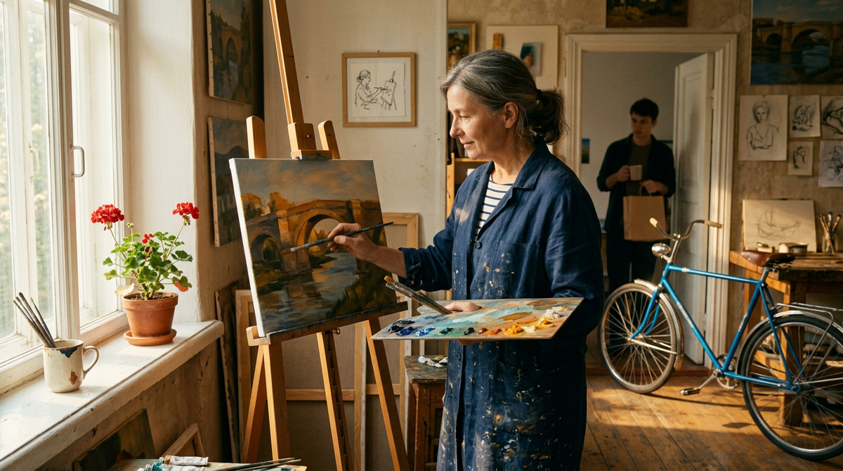 На стене — салфетка в рамке. Женщина у мольберта. Седая прядь у виска.