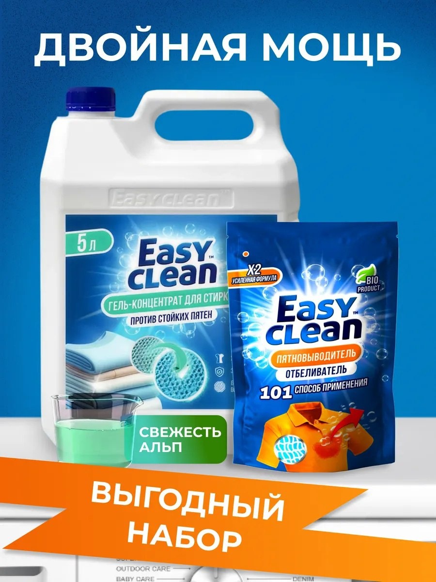 😄 🧴 ГЕЛЬ-КОНЦЕНТРАТ ДЛЯ СТИРКИ, 5 Л Тот самый «работяга», который стирает всё подряд: 👕 белое и цветное 👶 детские вещи 🛏 постельное и многое другое Экономичный, мощный и без агрессивной химии. ✨ КИСЛОРОДНЫЙ ПЯТНОВЫВОДИТЕЛЬ — 101 способ применения: 🏠 Кухня — посуда, чайники, кастрюли, вытяжки 🛁 Ванная — плитка, швы, сантехника 👕 Одежда — освежить, отбелить, усилить стирку 👟 Обувь — вернуть белизну 🧸 Детское — игрушки, коляски, текстиль 🪟 Пластик, подоконники, поверхности Один порошок - половина бытовой химии в шкафу 😅 💙 Вместе — это универсальный набор для всего дома. 👉 Забирайте набор из 2 бестселлеров на WB