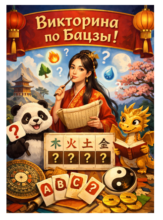 Сегодня публикую Викторину по Бацзы № 2. Карта женщины и ее десятилетние такты Вопросы такие: 1. Что Вы можете сказать о внешности женщины: красивая, симпатичная, или нет, полная, худенькая или среднего телосложения? 2. Характер 3. Какая у нее может быть профессия? 4. Что может означать в браке и карьере фаза Ци «Обрыв, Исчезновение» в столпе дня и месяца? Попробуйте свои силы в Бацзы. Ответы присылайте мне по обратной связи сайта. Или пишите в комментариях, если ответы короткие. Ответы будут опубликованы 7 марта. И дорогие женщины к Празднику 8 марта Вам подарок – скидка на консультацию по одному вопросу 50%. Скидка действует до 10 марта включительно. Если предложение заинтересовало, то пишите мне на сайт