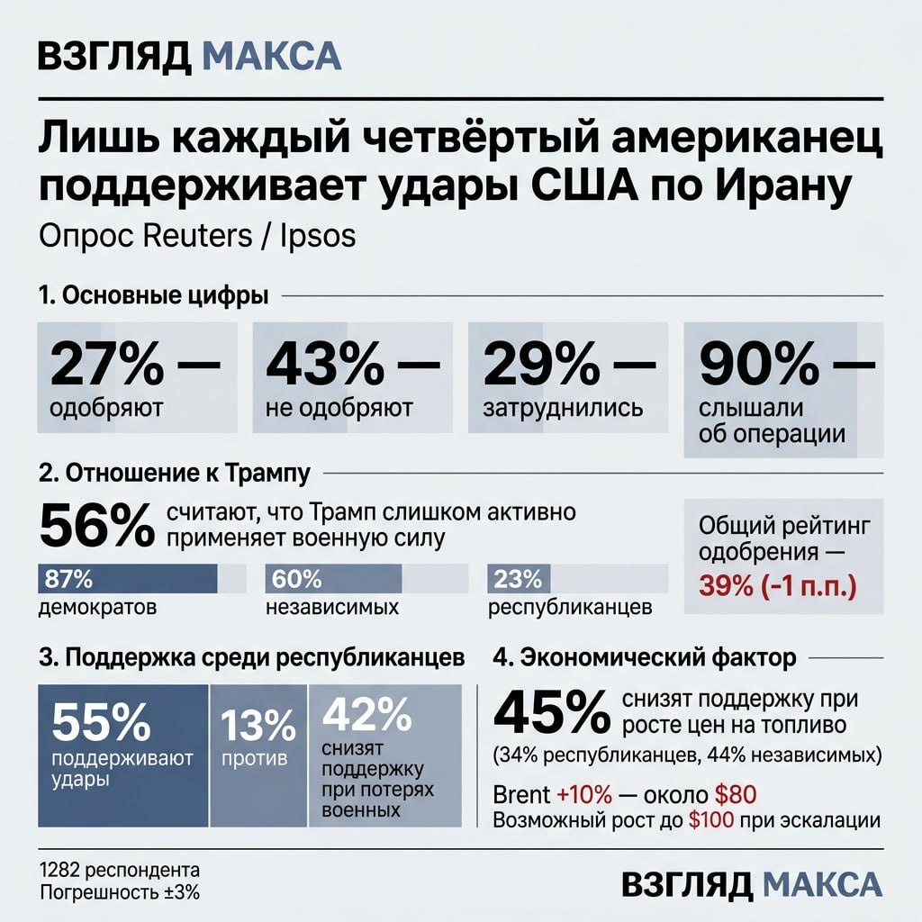 Об этом свидетельствуют результаты совместного опроса Reuters и Ipsos, завершившегося в воскресенье. Согласно исследованию, 27% респондентов одобряют удары, 43% — не одобряют, ещё 29% затруднились с ответом. При этом около 90% опрошенных заявили, что слышали о начале операции. 56% американцев считают, что Дональд Трамп слишком активно прибегает к военной силе для продвижения интересов США. Такого мнения придерживаются 87% демократов, 60% независимых избирателей и даже 23% республиканцев. В целом рейтинг одобрения деятельности Трампа на посту президента снизился до 39% — на один процентный пункт меньше по сравнению с предыдущим опросом. При этом среди сторонников Республиканской партии 55% поддерживают удары по Ирану, 13% выступают против. Однако 42% республиканцев заявили, что будут менее склонны поддерживать кампанию, если она приведёт к гибели или ранениям американских военнослужащих на Ближнем Востоке. Опрос проводился до того, как американские военные сообщили о первых потерях: