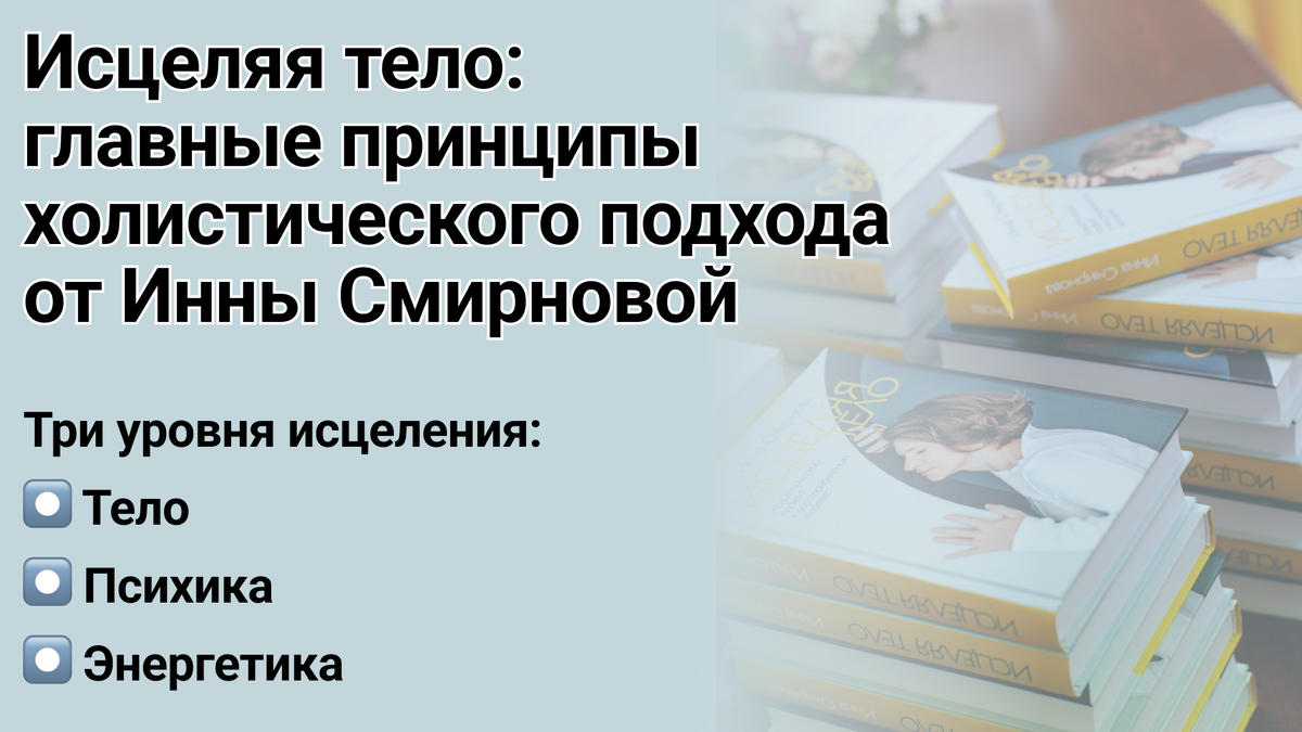 Выдержка из книги Инны Смирновой "Исцеляя тело. Холистический подход к восстановлению человека" Что представляет собой холистический подход Один из главных принципов холизма гласит: целое есть нечто большее, чем сумма его частей, и потому оно не сводимо к своим частям. С холистической позиции весь мир — единое целое, а выделяемые нами явления и объекты имеют смысл только как часть общности. Точно так же в холистическом подходе к восстановлению важно воспринимать человека как единое целое, которое состоит из множества взаимосвязанных частей — систем, органов, клеток и так далее, — каждая из которых не должна рассматриваться и подвергаться воздействию по отдельности, вне связи с другими частями, а также вне связи с тем, кто производит воздействие. Под холистическим подходом я подразумеваю комплексную одновременную работу на трёх уровнях — уровне физического тела (структуры), уровне психики (чувств, эмоций, ментальности), уровне энергии (энергетических меридианов тела, чакральной системы)