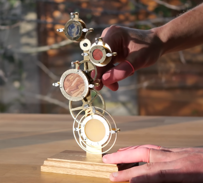 Специалисты из Chronova Engineering сконструировали Interplanetary Clock ("межпланетные часы"). Это устройство из 131 детали, которое отображает время на Марсе, Юпитере и Сатурне. Часы учитывают разную скорость вращения планет и показывают положение солнца относительно их поверхности. Изображение: https://www.popsci.com/ Если человечество когда-нибудь будет жить на Марсе, то необходимо иметь понимание о местном времени. Сутки на Красной планете длятся почти на 40 минут дольше земных. А на газовых гигантах вроде Юпитера определить время еще сложнее , ведь у них нет твердой поверхности, за которую можно зацепиться. Британские мастера решили эту проблему с помощью механики. Они собрали часы из 131 детали. Внутри семь зубчатых передач, которые связывают вращение Земли, Марса, Юпитера и Сатурна. На каждом циферблате изображен вид планеты с северного полюса. Три стрелки показывают, где сейчас восход, зенит и закат. Главная сложность состоит в том, чтобы подобрать правильное количество зубьев