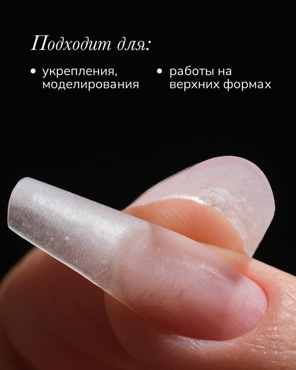 Знакомим вас с Fiber Gel - супер прочным и густым гелем со стекловолокном. За счет чего прочность покрытия и надежность в носке увеличивается в 2 раза. Наносим на верхние формы, волокно не торчит = не нужно тратить время на опил. Главное его достоинство - способность выдерживать большие нагрузки при тонком слое моделирования или укрепления. Хоть кирпичи таскайте, хоть землю ройте, с маникюром ничего не случится!