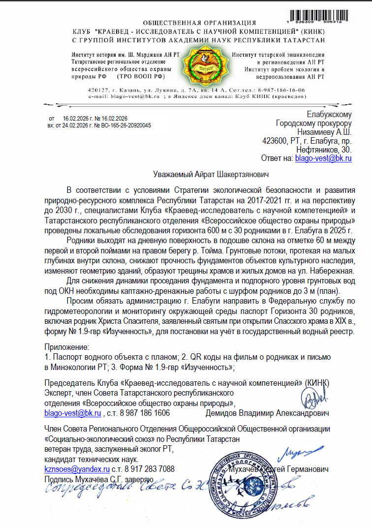 По обращению старожилов г. Елабуги к общественным экспертам 07.03.2025 г. организован выезд на родник 14.03.2025 г. На условиях статьи 1.5 Водного кодекса проведены работы по определению геологических, гидрологических и морфометрических характеристик водного объекта. В результате обследования экспертом, членом Совета ТРО ВООП Демидовым В. А. была охвачена территория от источников до устий речек Ела, Буга, Шумиха и пойма на право-левобережьях р. Тойма в южной части города. Выявлен горизонт длиной 600 м из 30 родников и криниц. Обосновано то, что город является карстовым гнездом "Елабужское" с сечением (З-В) 4,2 км. Автором подготовлен трактат с описанием, выводами, рекомендациями, видео и фото фиксацией объекта, который рекомендован в виде пособия для школ. Разработанный паспорт водного объекта по форме 1.9 «Изученность» направлен в Минэкологию РТ № Кол/2336 от 27.08.2025 г. для содействия в включении в Государственный водный реестр. Однако, Глава Елабужского м.р. РТ (мэр Елабуги) решил