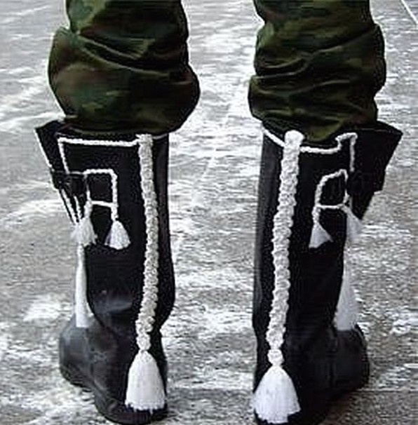Вчера была публикация о солдатских сапогах и просматривая фотографии в интернете я увидел вот такой "шедевр". И у меня только один вопрос, который можно озвучить на платформе Дзен - на фига? Желание выделиться понятно, но куда и как в этом пойдешь? Засмеют ведь. Вот еще образец: Готовиться такая обувка к дембелю, кроме обуви я уже публиковал образцы формы приготовленной к этому случаю. Такое метко обозвали Швейными войсками. Мы как-то поскромнее готовились к окончанию службы. Погоны на рубашку, помнится украшали медной тонкой проволокой, еще брали годичку с тремя полосками и на одной вырезали надпись МО ПВО: Буквы были "золотого" цвета, как на этом снимке: И еще мне попался вот такой шеврон, жалко мы до такого не додумались, смотрится очень красиво: Вот и все наши украшательства дембельской формы. А во время службы, кто-то наглаживал сапоги до зеркального блеска, делая их похожими на трубы, у нас же было принято "набивать" гармошку. Вот и на этом фото трое поварят еще не отслуживших