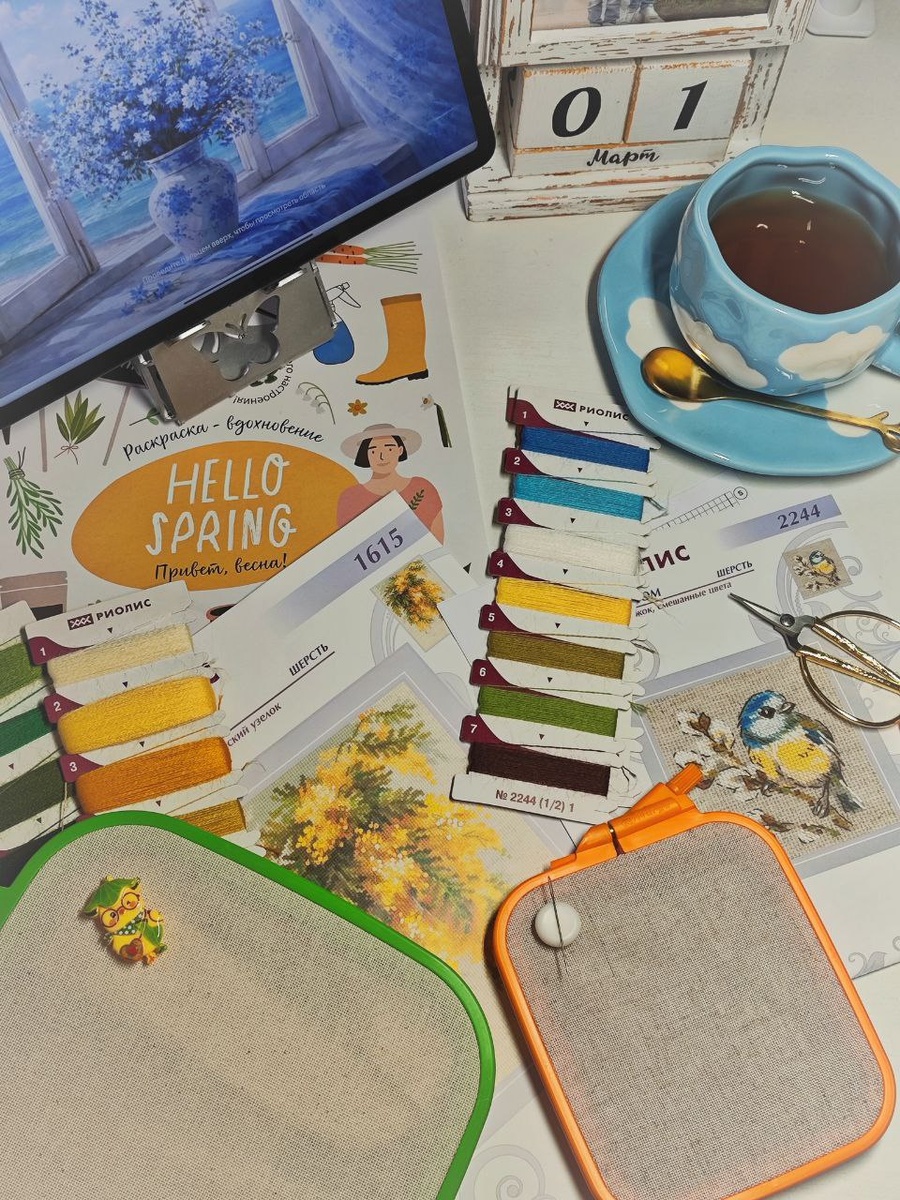 Конечно же это цветы и птички 🟢🟢🟢🟢🟢🟢🟢🟢 Так уж совпало, что оба сегодняшних старта это наборчики от фирмы Риолис. Очень давно я не вышивала шерстью. Приурочим это к 30ти летнему юбилею данного производителя! Очень нравятся мне многие их дизайны, а тот факт, что отшивы выполняются преимущественно в шерстяных нитках, превращает вышивку в очень атмосферное мероприятие✨ Синичка 🐥 уже вырисовывается, ждёт веточек вербы, на которых будет ютиться и греть свои яркие пёрышки под лучами солнца 🌞 Шью не совсем по ключу, вместо 3х нитей в 2. Основы заменила на равномерные лен и хлопок (для мимозы) меньшего каунта. Мимоза 🌼получит свои первые крестики перед сном. Как у вас дела? Чем занимались в этот первый весенний денёк? 🌤️