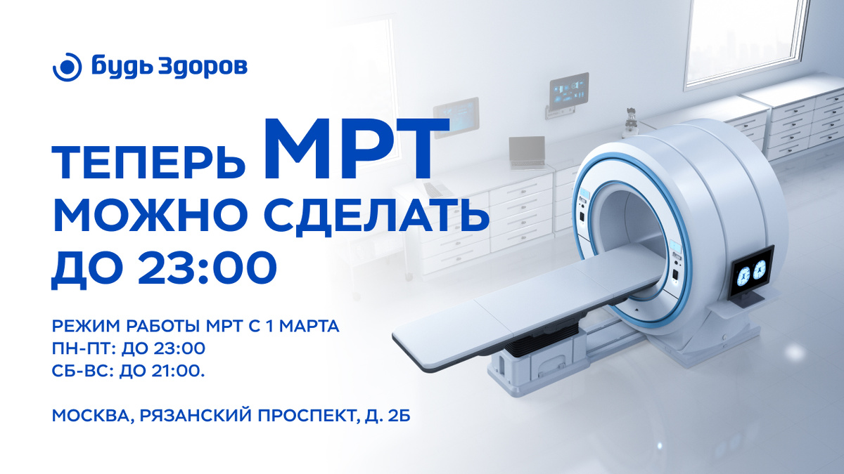 Хорошие новости для тех, кто не успевает пройти обследование днём. С 1 марта в клинике «Будь Здоров» на Рязанском проспекте расширен режим работы кабинета МРТ. Пн-Пт — до 23:00 Сб-Вс — до 21:00 Больше не нужно отпрашиваться с работы или переносить важные дела. Вы можете записаться на удобное вечернее время и пройти исследование без спешки. 📍 Москва, Рязанский проспект, д. 2Б Записаться можно по телефону +7(495)-121-31-42, в нашем мобильном приложении или на сайте. Будь здоров