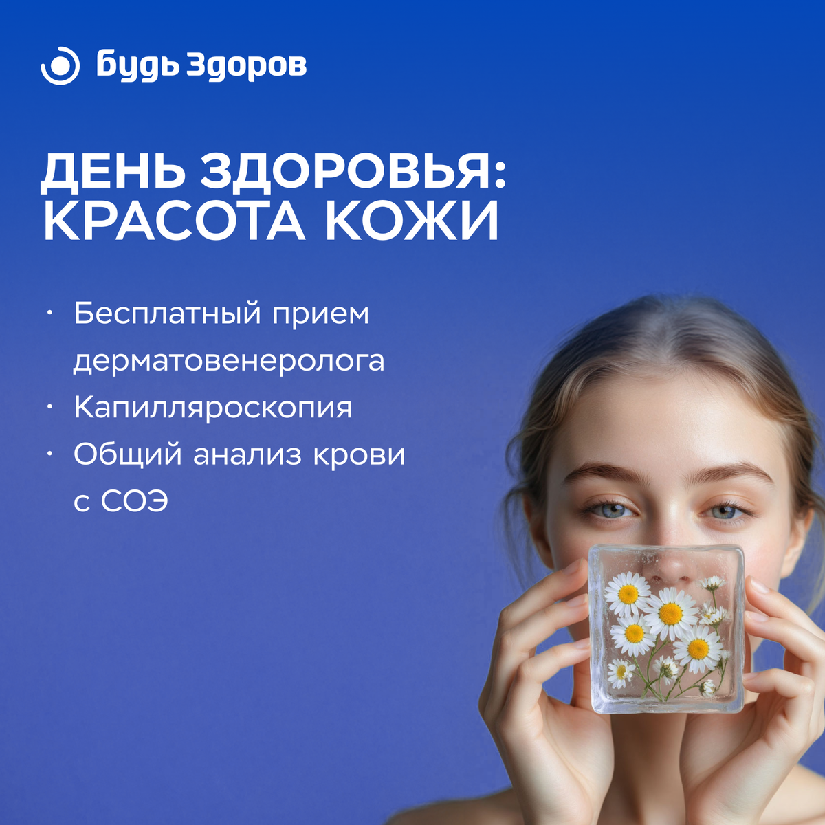 7 марта в клинике «Будь Здоров» на Сретенке состоится День здоровья, посвященный красоте и здоровью кожи. В рамках акции вы можете бесплатно получить: ✅ первичный приём врача-дерматовенеролога ✅ капилляроскопию ✅ общий анализ крови с СОЭ и лейкоформулой Все услуги предоставляются бесплатно при выполнении условий акции. Также анализы и манипуляции, назначенные в день приёма, можно будет пройти со скидкой 15% в течение 3 дней после получения направления. Чтобы принять участие: ➖ подпишитесь на Telegram-канал «Будь Здоров» ➖ назовите промокод DENZDRAV3 при записи и на стойке регистрации Такие Дни здоровья мы проводим в клинике регулярно. Подпишитесь, чтобы не пропустить следующие мероприятия! Записаться в клинику можно по телефону +7(495)009-88-82 , в мобильном приложении «Будь Здоров», на сайте или написав нам в личные сообщения группы в телеграме ❗️Акция распространяется на пациентов, которые ранее не посещали клиники «Будь Здоров» 📍 Москва, ул. Последний переулок, д. 28 Будь здоров