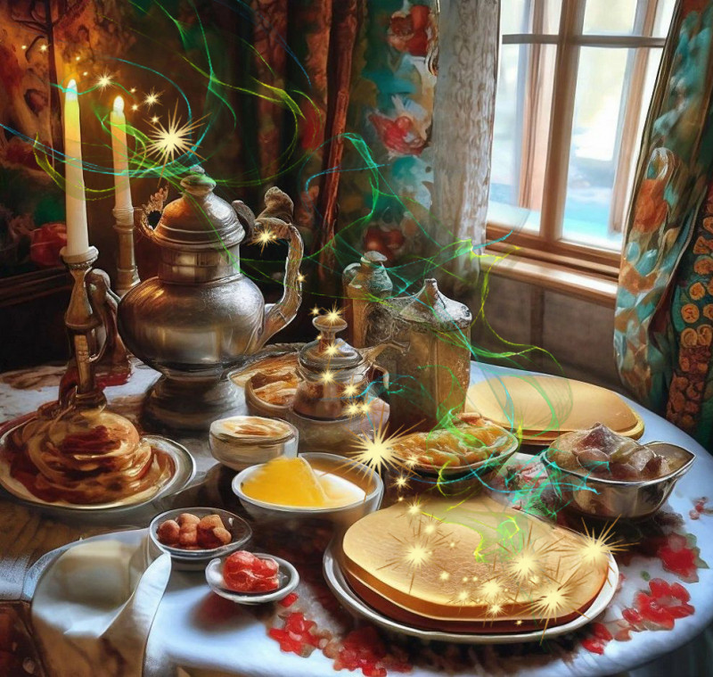 Вот тут-то дело и заспорилось! Блинчики — кружевные, золотистые — сами переворачивались и в ровную стопку складывались. Достала Василика скатерть нарядную, посередь стола блюдо блинов поставила, а вкруг — плошечки-тарелочки с вареньем малиновым да земляничным, мёдом липовым, творогом да топлёным маслицем. Нарядилась, голову платком узорчатым покрыла, села за стол, сложила смиренно ручки и стала гостей ожидать.