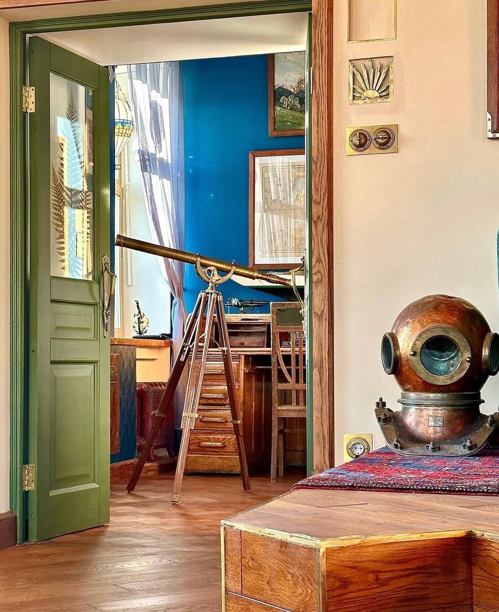 Представьте: вы сидите на широком подоконнике старинного дома, перед вами — изгиб Фонтанки, Египетский мост, сфинксы и медленно проходящие по реке корабли. Или лежите в гамаке у окна и смотрите на город, который невозможно не любить. Эта квартира на Фонтанке — не просто место для ночёвки. Это пространство, в котором живут, снимают кино, проводят квартирники и фотосессии, и куда возвращаются за вдохновением. Квартира расположена в историческом доме-памятнике с лифтом и высокими потолками — тем самым классическим петербургским домом, о котором обычно мечтают гости города. Планировка — круговая, что само по себе уже редкость. Интерьер создан художниками-декораторами Петербурга: Здесь легко почувствовать себя героем романа или фильма: антикварная раковина Шаляпина, старинные водолазные шлемы, винтажная коллекция скейтов, большая библиотека, душ Калье и изразцовый камин. Всё это создаёт атмосферу авантюризма, дальних странствий и захватывающих приключений. В квартире — восемь панорамных око