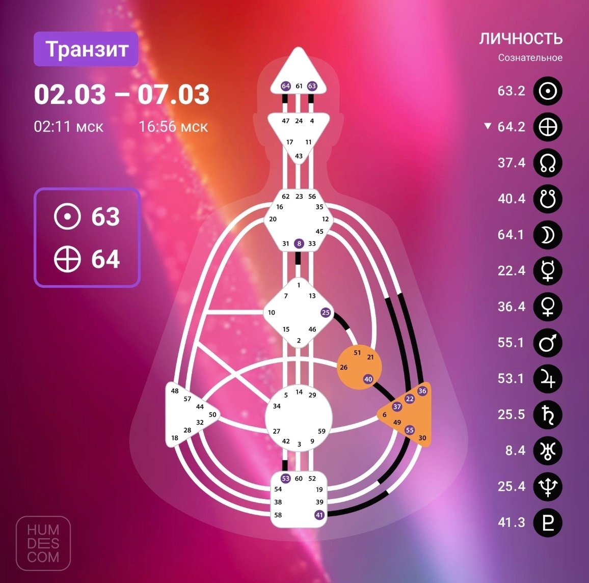 ▶️ с 2 марта (02:11 мск) ⏹️ по 7 марта (16:56 мск) Солнце в 63 Воротах Сомнений Земля в 64 Воротах Замешательства Это интересный транзит, который может проявиться по-разному: у кого-то будут актуальны вопросы прошлого, у кого-то — будущего, а у кого-то активируются и те, и те. Что касается первого варианта проявления, то есть смысл задуматься о том, что уже произошло, и попытаться найти в этом рациональное звено. Это вообще благоприятное время для анализа, накопления энергии и тщательного планирования будущих шагов. Приспосабливайтесь и и выжидайте нужного момента для проявления. Что касается второго варианта, то тут тоже не обойтись без внимательности, только наблюдать следует за тем, что уже происходит. Не следует пытаться заканчивать уже начатые процессы и создавать беспорядок — за это можно получить не очень приятную обратную связь от людей и самой Вселенной. Погрузитесь в анализ возможных проблем, продумывайте действия на несколько шагов вперёд и простраивайте план действий пр