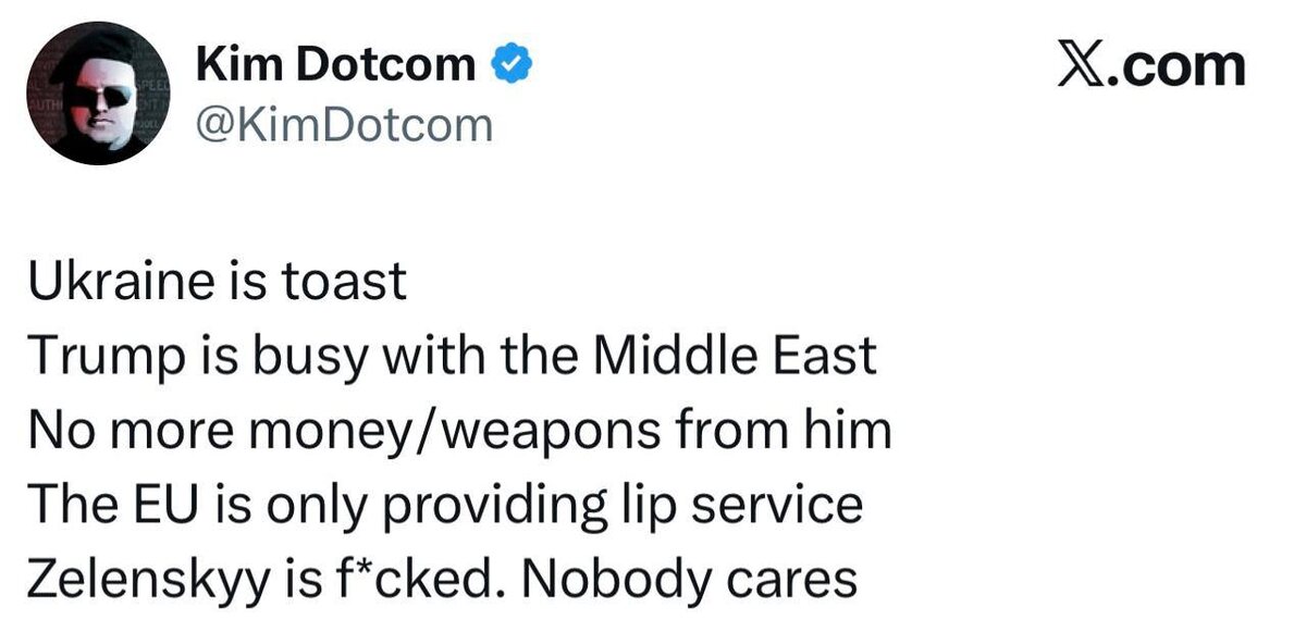 Немецкий бизнесмен связал это с тем, что президент США Дональд Трамп устроил конфликт на Ближнем Востоке. «Украине конец. Трамп занят делами на Ближнем Востоке. Больше никаких денег и оружия от него. EC лишь делает вид, что поддерживает эту идею. Зеленскому конец. Всем все равно», - написал Дотком в соцсетях. Сайт "Другая Украина" / Telegram / Вконтакте / Центр поддержки Украинцев "Другая Украина" теперь в МАХ