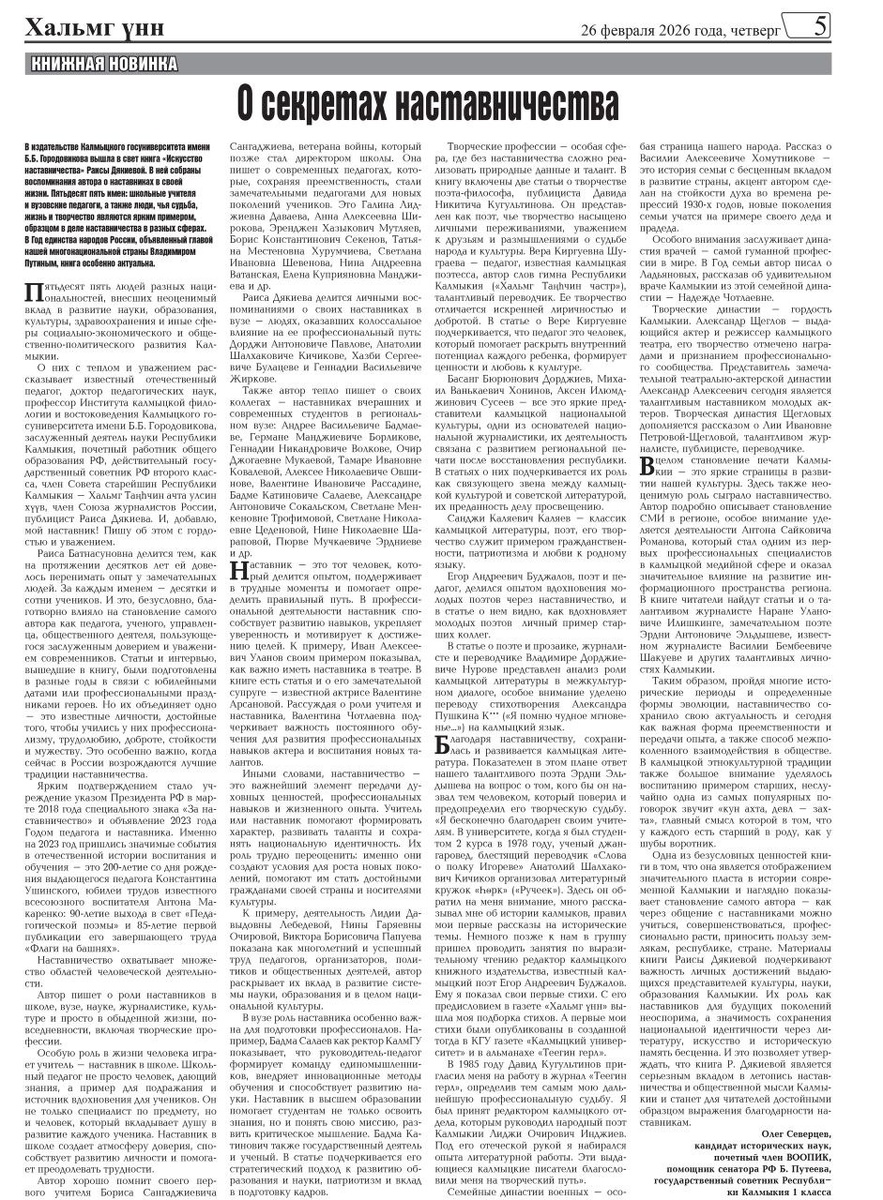 Завтра, 2 марта в 14:00 часов в Национальной библиотека им. А.М. Амур-Санана состоится презентация книги доктора педагогических наук, профессора, завкафедрой Института калмыцкой филологии и востоковедения КалмГУ имени Б.Б. Городовикова уважаемой Раисы Батнасуновны Дякиевой «Искусство наставничества». Мне были оказаны автором честь и доверие выступить с Предисловием к этому серьёзному исследованию. На фотографии - газета версия Предисловия, опубликованная в газете Хальмг Унн (с которой я сотрудничаю почти четверть века) 24 февраля 2026 года. Это действительно серьёзное, практически первое исследование, посвященное института наставничества.