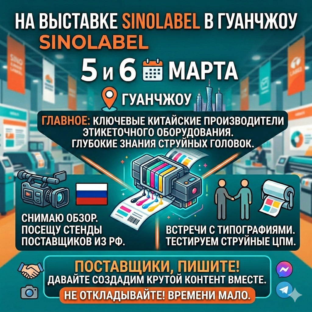 5 и 6 марта я буду на выставке SinoLabel в Гуанчжоу — на локальной, но очень важной выставке этикеточного оборудования, где будут все ключевые местные производители оборудования. Собираюсь снять обзор выставки и посетить обязательно стенды тех производителей, где будут поставщики из РФ. Буду также рад пообщаться с типографиями, кто будет на выставке. Мне кажется, у меня есть файл, который может протестировать струйный этикеточный ЦПМ, рад был бы его протестировать или поделиться файлом, если кому интересен этот тестовый файл или личная встреча. Напишите, пожалуйста, в личку по поводу встречи на выставке SinoLabel — https://t.me/sergeybelokurov Времени мало, встреч очень много. Пожалуйста, не откладывайте, напишите. Самое ключевое — это понимание возможностей струйной печати, сердцем которой является струйная печатающая головка, а про неё, кроме меня, мало кто знает больше в СНГ. Поставщики, пожалуйста, тоже не стесняйтесь, пишите, я всё посещу обязательно, давайте сделаем интересный д