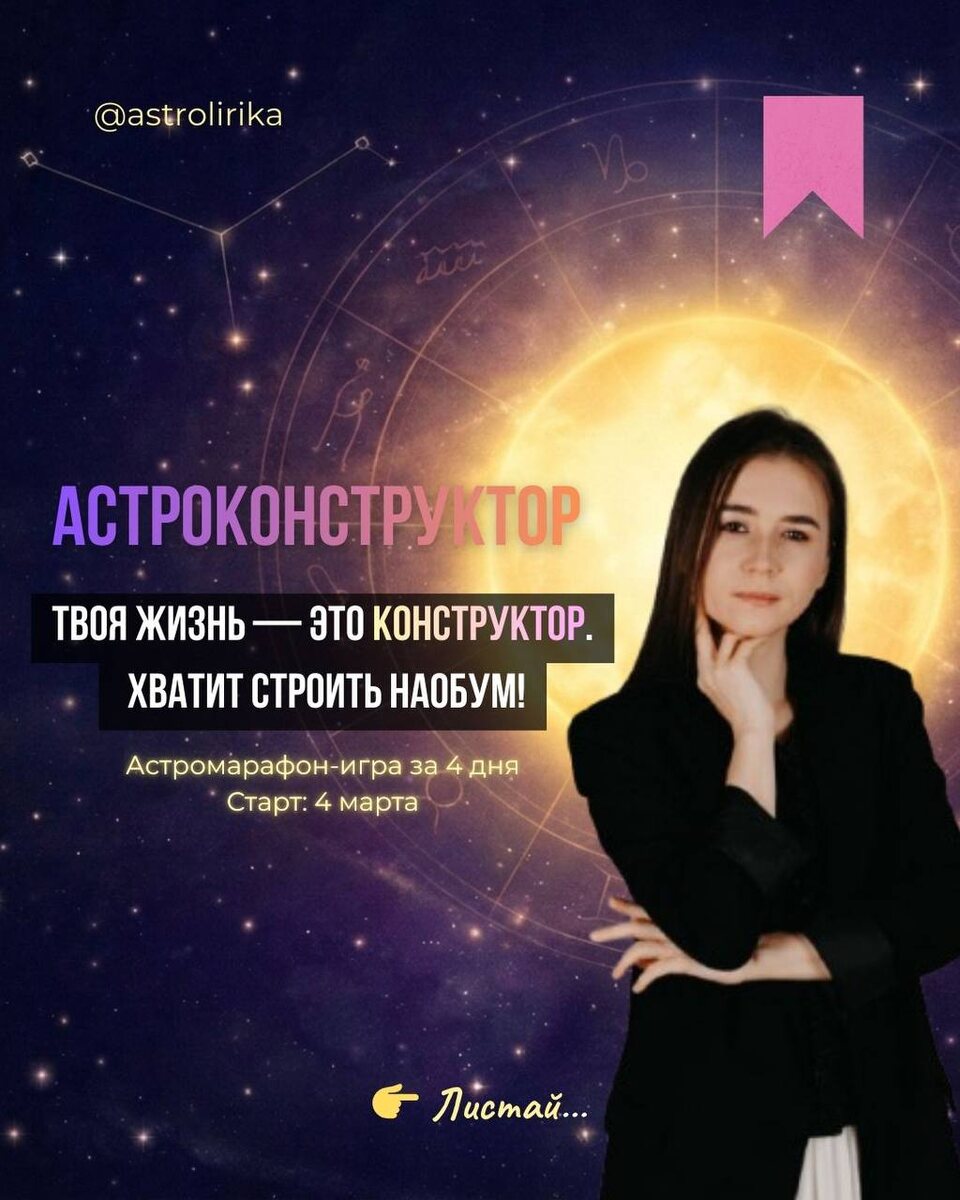 НО ГДЕ ИНСТРУКЦИЯ? Начну с банального: как жизнь? Только честно? ❤️ Чувствуешь ли ты радость и энергию от того, как проживаешь каждый свой день? Вот прямо сейчас, пока читаешь эти строки: ❓ Ты на своем месте? Твоя жизнь — это захватывающее путешествие? ❓ Ты реализуешься и раскрываешь свой потенциал, а не закапываешь его в рутине? ❓ Ты чувствуешь любовь внутри и искреннюю радость просто от того, что ты есть? ❓ Ты безусловно любишь себя, свое тело и свою реальность? Если это звучит как «сказка из соцсетей», значит, ты пытаешься собрать себя по чужим чертежам. 💫 Я запускаю 4-дневный марафон-игру «АСТРОКОНСТРУКТОР». Мы не будем слушать скучные лекции. Мы будем собирать ТВОЮ идеальную систему по твоей натальной карте. Что мы сделаем за 4 дня? ✅ Настроим твой «социальный лифт» и стиль (Асцендент). ✅ Включим источник внутренней силы и смыслов (Солнце и Луна). ✅ Хакнем денежный канал (2 дом и МС). ✅ Разберем твой личный магнетизм. ⚙️ ЭТО НАСТОЯЩАЯ ИГРА: За задания вы будете получать не