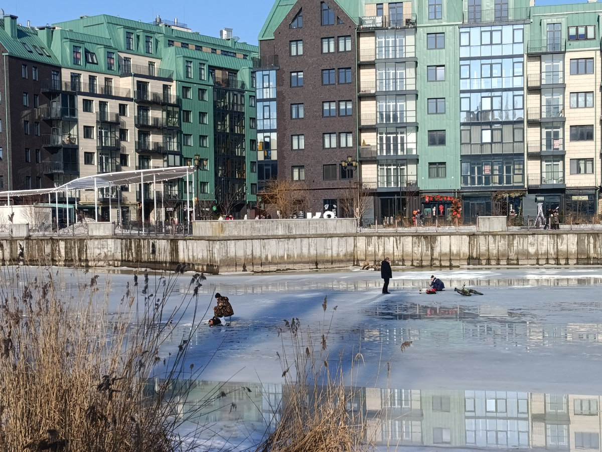 Вот первая фотография, рыбаки на Преголе занимаются подледным ловом. Хотя лёд уже заметно подтаял.