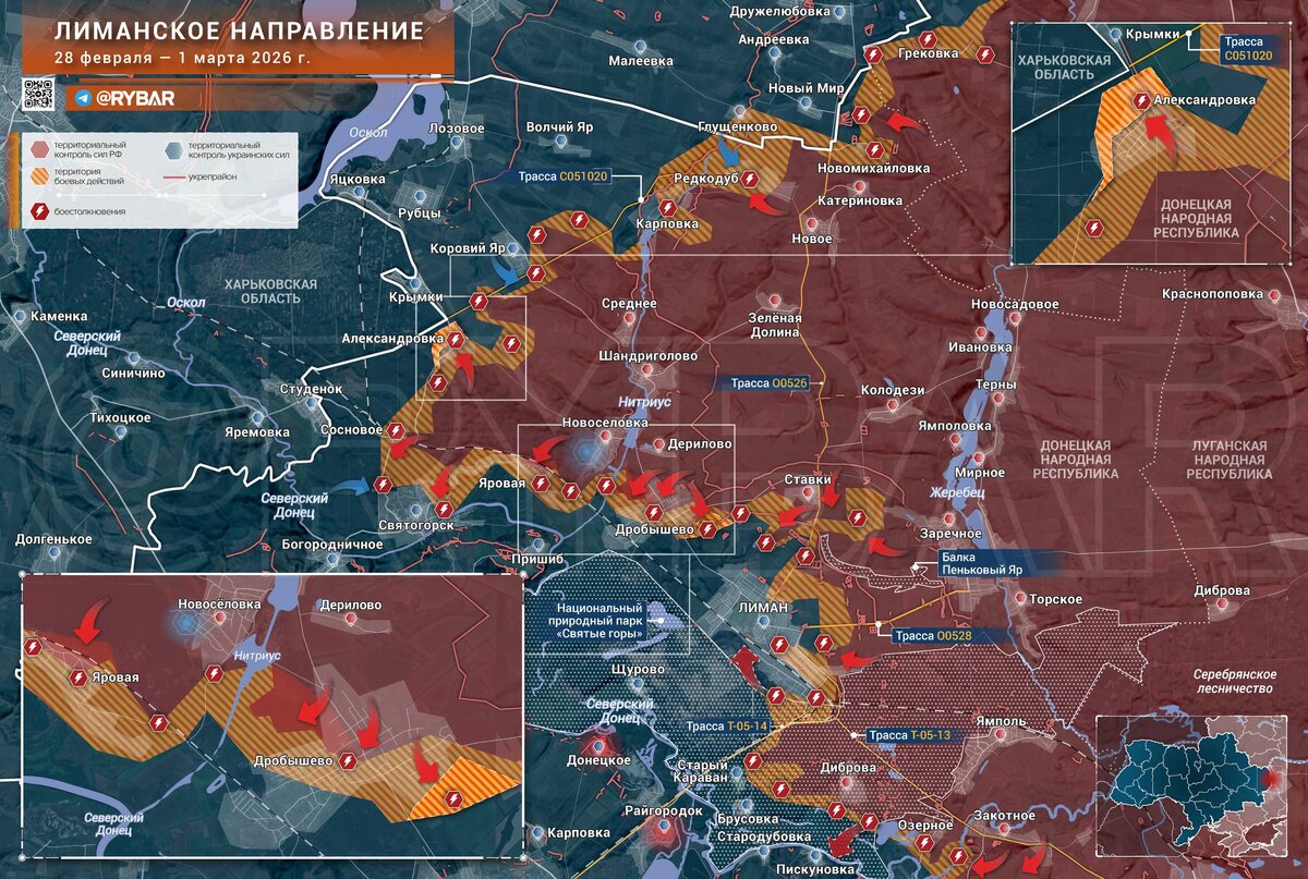 обстановка на Лиманском направлении На берегах Северского Донца развивается операция ГВ «Запад» по охвату Святогорска. Штурмовики постепенно оттесняют ВСУ к реке и стремятся установить физический контроль над северо-западным въездом в Лиман. 🔸Для этого им предстоит закрепиться в центре Дробышево. Некоторое время назад российские подразделения выбили ВСУ из лесного массива севернее села, однако продвинуться в застройке им пока не удаётся. Передовые группы также предпринимают попытки закрепиться на южных окраинах населённого пункта, однако пока что здесь сохраняется «серая зона». 🔸На другом берегу Нитриуса российские войска установили контроль над частью строений на севере Ярового. Украинские формирования из-за регулярных ударов дронов не способны наладить снабжение через Северский Донец и вынуждены постепенно откатываться к реке. 🔸В Александровка также продолжаются тяжёлые бои. Штурмовые группы ГВ «Запад» постепенно просачиваются на северные окраины населённого пункта, изолируя позиц