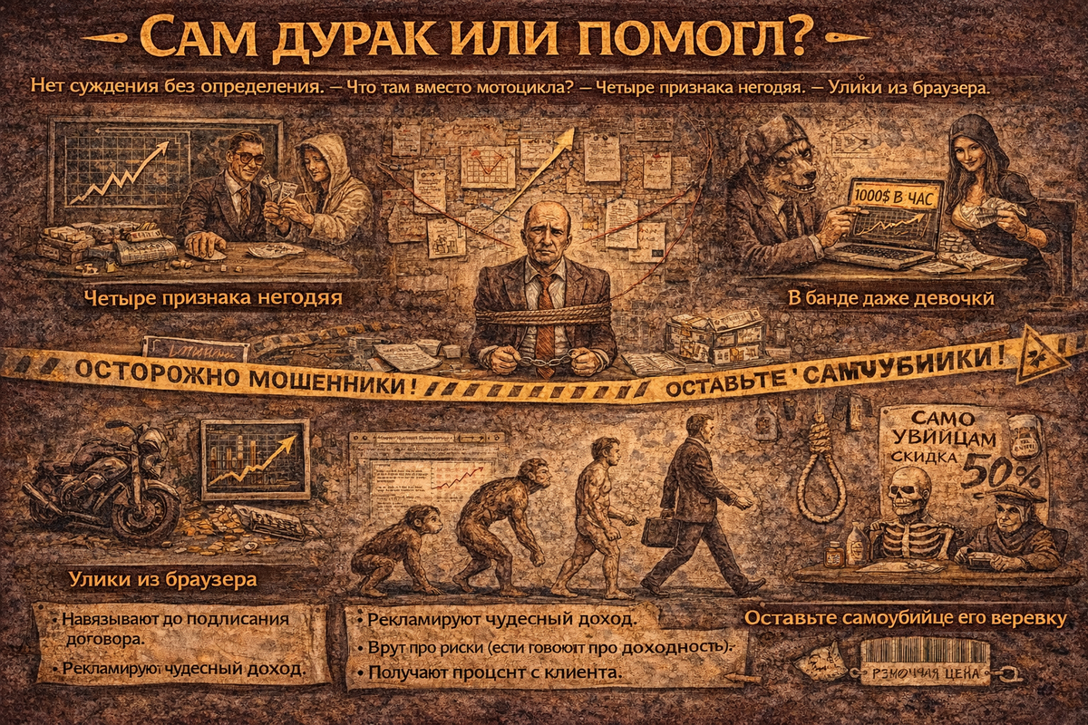 Нет суждения без определения. Что там вместо мотоцикла? Четыре признака негодяя. Улики из браузера. В банде даже девочки. Уголовная статья за мошенничество — одна из самых сложных для либертарианца. Где грань между агрессивным маркетингом и преступлением? Вам в дверь позвонили, пообещали лекарство от всех болезней, взяли деньги и убежали — это понятно. А если дали анальгин? А если он лежит в аптеке и рекламируется? А если чипсы оказались не самые вкусные в мире? Нам нужны формальные критерии. Нельзя судить за ущерб, если это единственное содержание претензии. Если человек убился на мотоцикле, это не повод подавать иск к производителю. Если вы слили депозит на бирже, претензия не принимается по итогу, а только по обстоятельствам. Но если вам продали бракованный мотоцикл под видом исправного — это другое. Важно, что продали не как металлолом, а как средство передвижения. Ключевой признак виновности: клиенту продали одно под видом другого, разница существенна, невыгодна для клиента, и пр