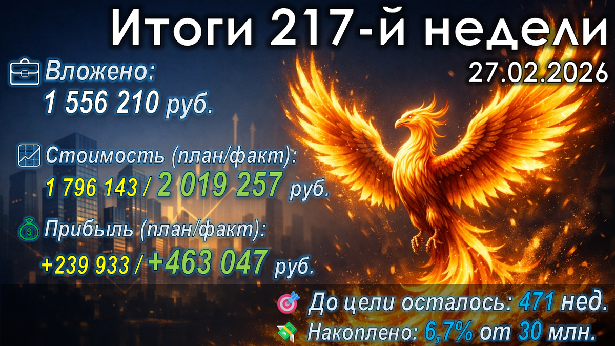 Если помните, в начале февраля я делился радостью, когда портфель впервые коснулся этой отметки. Сейчас же всё по-взрослому: текущая стоимость закрепилась выше психологического рубежа, и это зафиксировано итогами 217-й недели. Но главная гордость даже не в самой цифре, а в том, что к ней мы пришли на 3,5 месяца раньше, чем предписывает мой инвестиционный план. Тот самый план, составленный в конце 2021 года в совершенно другой реальности и ни разу не подвергавшийся правкам, несмотря ни на что.
