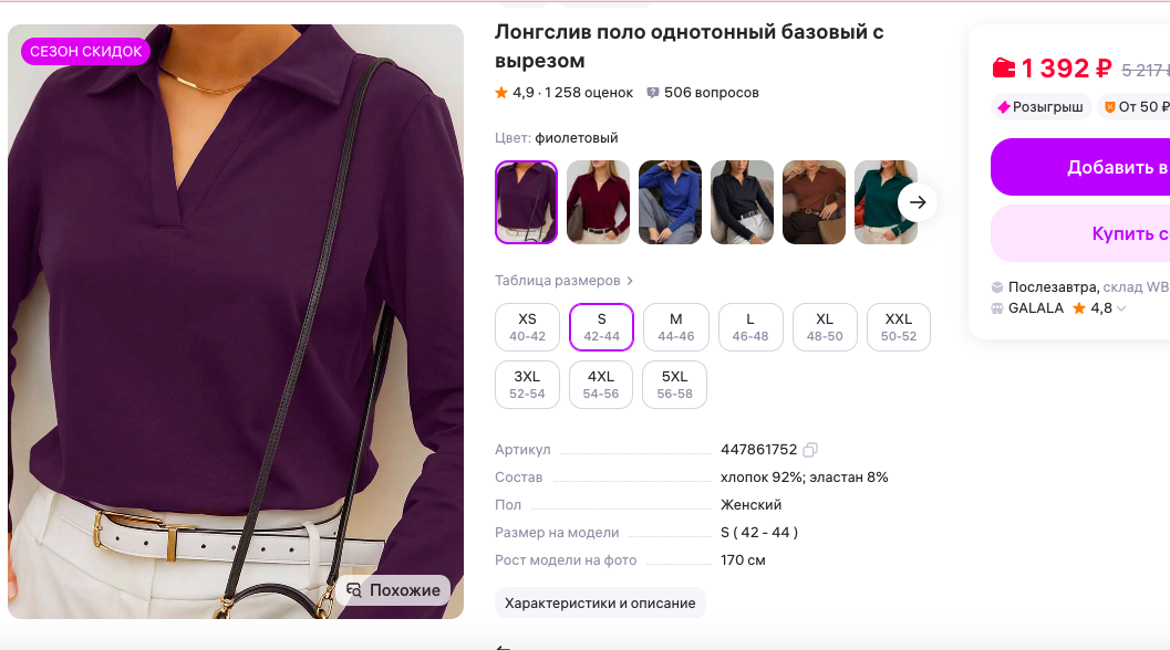 Вот честно: базовых вещей много не бывает. Но этот лонгслив — не просто «ещё одна базовая вещь». Фиолетовый цвет моментально выделяет из толпы. Он такой… загадочный, даже немного магический.