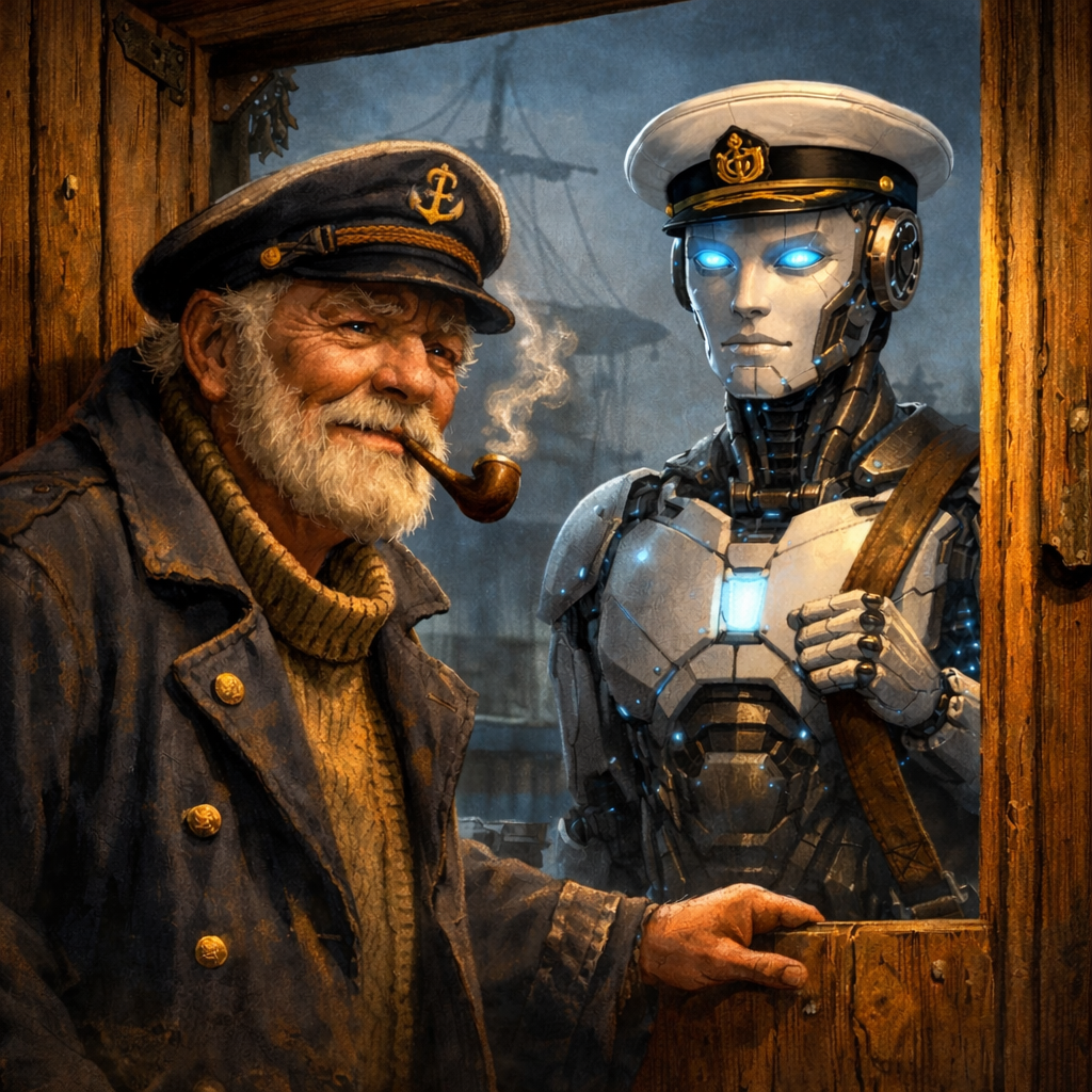 Стук был странный. Не как от ветра и не как от соседа Петровича, который вечно забывает ключи. Ровный такой, аккуратный. Я открыл дверь, а там стоит… железный тип в бескозырке. Глаза светятся, спина прямая, молчит.
