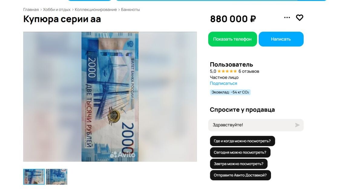 В Орле продают банкноту номиналом две тысячи рублей за 880 тыс. рублей. Продавец указывает на редкую серию и красивый номер. Объявление появилось на сайте «Авито». В объявлении сказано, что купюра не была в обороте и имеет серию «аа». Банкноты именно этой серии считаются одними из первых выпусков. Для двухтысячных‑рублёвых купюр серия «АА» действительно является самой ранней, но сама по себе она встречается довольно часто — в обращение вышло около 100 млн таких экземпляров . Их коллекционная стоимость обычно начинается от 2,5 тыс. рублей и сильно зависит от сохранности. Однако итоговая цена может вырасти во много раз, если у банкноты так называемый «красивый» номер — например, состоящий из одинаковых цифр или симметричных комбинаций. За такие экземпляры коллекционеры готовы отдавать сотни тысяч рублей . Также ключевую роль играет состояние: в идеале банкнота должна быть без следов обращения, храниться в специальном холдере.
