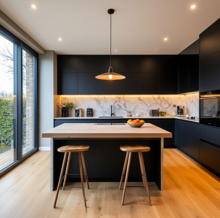 👉 Совет: не перегружайте пространство цветом. Выберите один акцентный элемент — остров, фартук или верхние шкафы — и поддержите его небольшими деталями: текстилем, посудой, декором. Так кухня будет выглядеть стильно, но не кричаще.