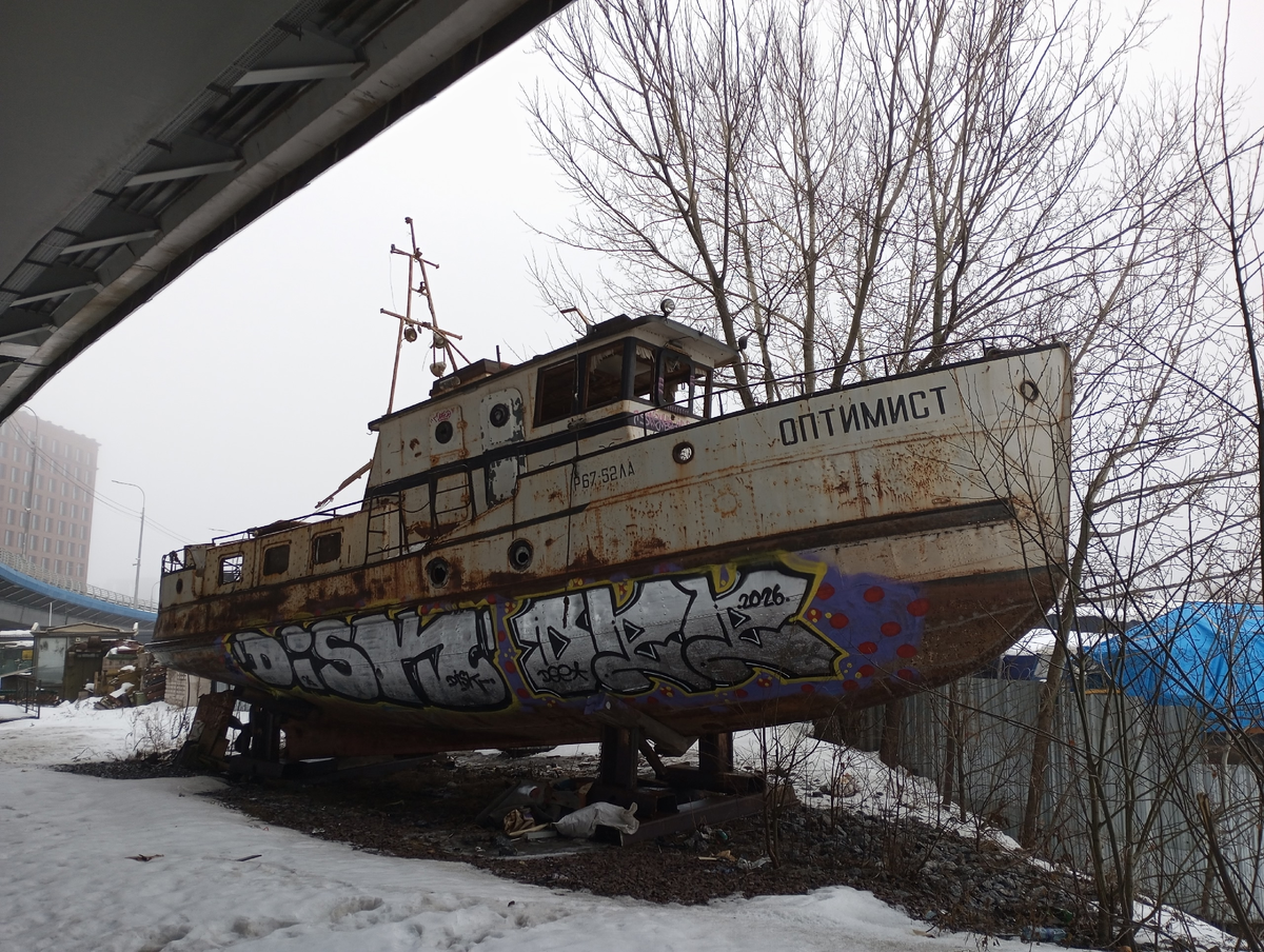И в правду говорят, что мегаполис явление необычное, и может удивить тебя буквально каждый день. И Санкт-Петербург не стал исключением. Кто бы мог подумать, что под обычной автодорожной эстакадой может стоять целая прогулочная яхта? Звучит интересно, не правда ли? Если бы я не увидел это чудо вживую, то и не поверил бы. История данной яхты является весьма загадочной. Я пытался поискать что-нибудь о истории её эксплуатации, но найти получилось только то что Оптимист был построен в 1936 году на одной из германских верфей. И после этого какие-либо сведения о ней теряются вплоть до 2022 года. Именно от этого года датируются первые фотографии яхты. Правда, к тому моменту она уже находилась на берегу на базе маломерного флота, а где-то в промежутке второй половины 2022-2023 года Оптимист покинул базу, и был поставлен за её территорией. К сожалению подобное решение сказалось не с самой лучшей стороны, поскольку яхта сильно пострадала от различных вандалов. Почти все стёкла были выбиты. Постр