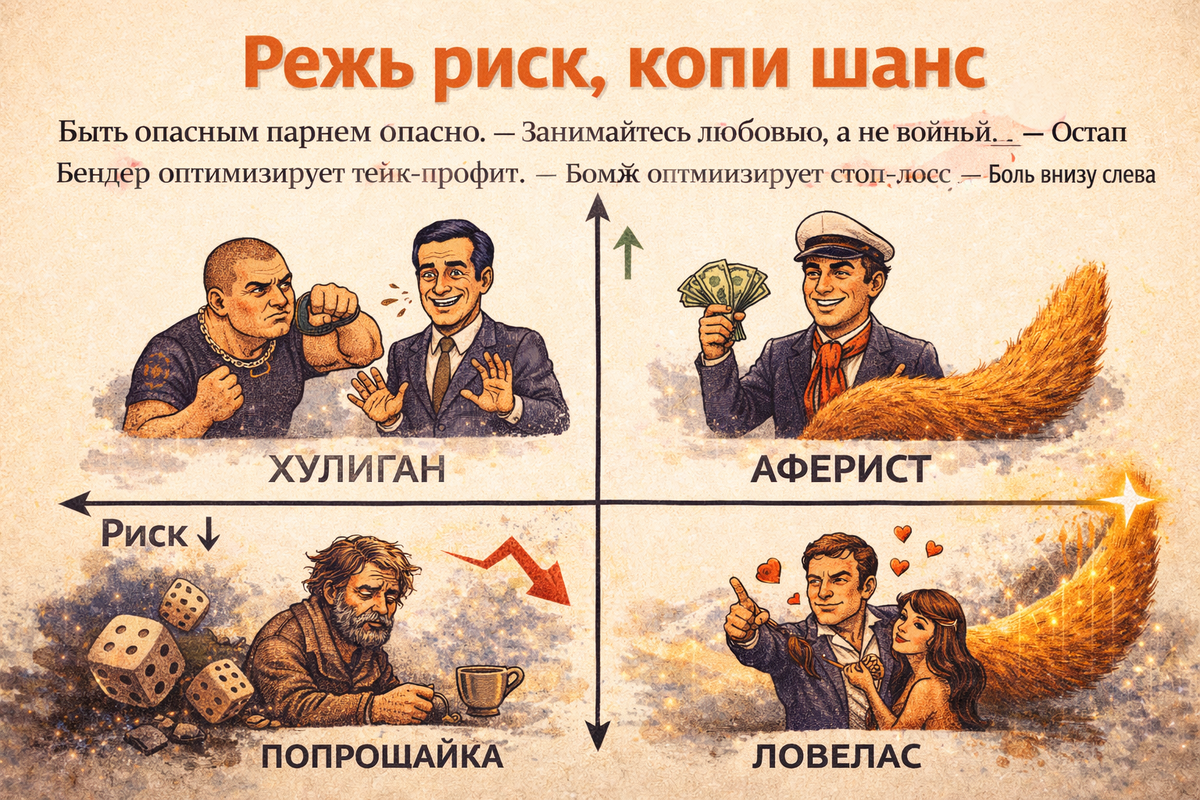 Быть опасным парнем опасно. Занимайтесь любовью, а не войной. Остап Бендер оптимизирует тейк-профит. Бомж оптимизирует стоп-лосс. Боль внизу слева. Наконец мы подошли к главному — истинному квадранту. Не тому, что придумал Кийосаки, а тому, который реально работает. У нас две оси: Оптимальная зона — правый верхний квадрат. Там, где риски минимальны, а потенциальный выигрыш максимален. Для наглядности рассмотрим четыре типажа на улице. Хулиган получает удовольствие от насилия. Он неплохо оценивает шансы и наезжает только на слабых. Большинство его стычек заканчиваются победой. Математика: Он может 100 раз победить, а на 101-й нарваться на бойца сильнее. Или на полицию. Три месяца гулянок — три года тюрьмы. Сложив шансы и риски, он — больший лох, чем его жертвы. Жертва рискует значительно меньшим. Иллюзия работает, потому что бóльшая часть ставок выигрывает. Он двигается от победы к победе — пока не проиграет по-крупному. Ловелас ищет привлекательных незнакомок. Цели: приятный разговор,