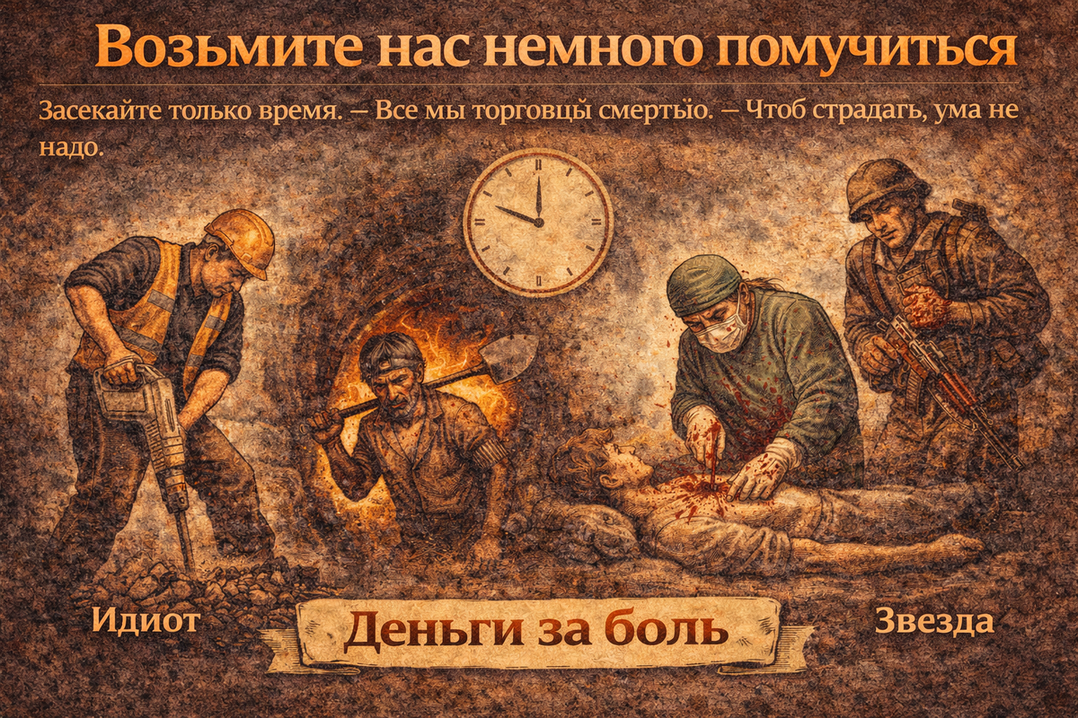 Засекайте только время. Все мы торговцы смертью. Чтоб страдать, ума не надо. Мы подошли к самому массовому способу получения денег — работе за зарплату. Или, как это называется в нашей модели, "деньги за боль". Марксизм и классическая политэкономия строились на том, что единственный праведный источник дохода — труд. А всё остальное — эксплуатация. Фабрика XIX века как никакое другое место подходила под теорию страдания. Если бы за труд не платили, им бы не занимались. Нет мотивов быть фабричным рабочим, кроме одного — тебе заплатят. Труд — это трудно. В худшем случае невыносимо мучительно (рабы в рудниках), в лучшем — просто скучно (офисный планктон). Никто не будет чистить сортиры ради удовольствия или славы. Ради славы можно убить дракона, ради тренировки — жать штангу. Но на каждого дракона — тысяча сортиров, и кто-то должен их чистить. Очередь на дракона занята на годы вперед, а дерьмочистов всегда нехватка. В марксизме мерой труда выступает только время. Час работы стоит 10 у.е.,