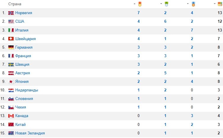 🥇🥇. Норвегия продолжает удерживать первое место с семью золотыми медалями после пяти дней соревнований 🇳🇴. Тем временем сборная США продемонстрировала впечатляющий прогресс, завоевав пять наград всего за один день 🇺🇸.