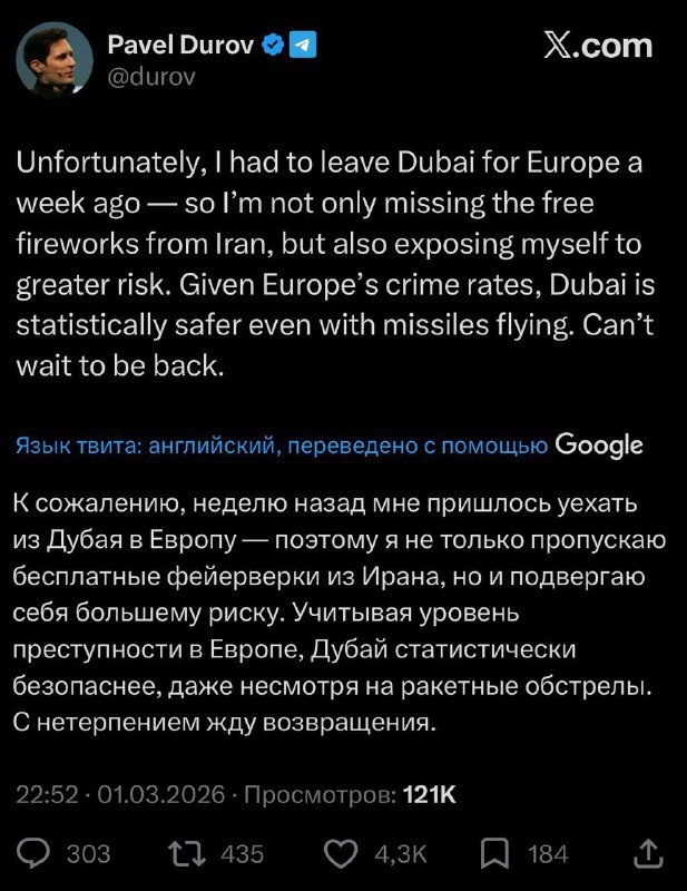 безопасно Дуров с сожалением отметил, что даже на фоне ракетных обстрелов в Дубае он чувствовал себя спокойнее, чем сейчас в Европе. Иногда география безопасности работает совсем не так, как нам кажется. Подробнее: https://hard-tm.su/threads/150191/ 🕹HARD-TM — Подписаться