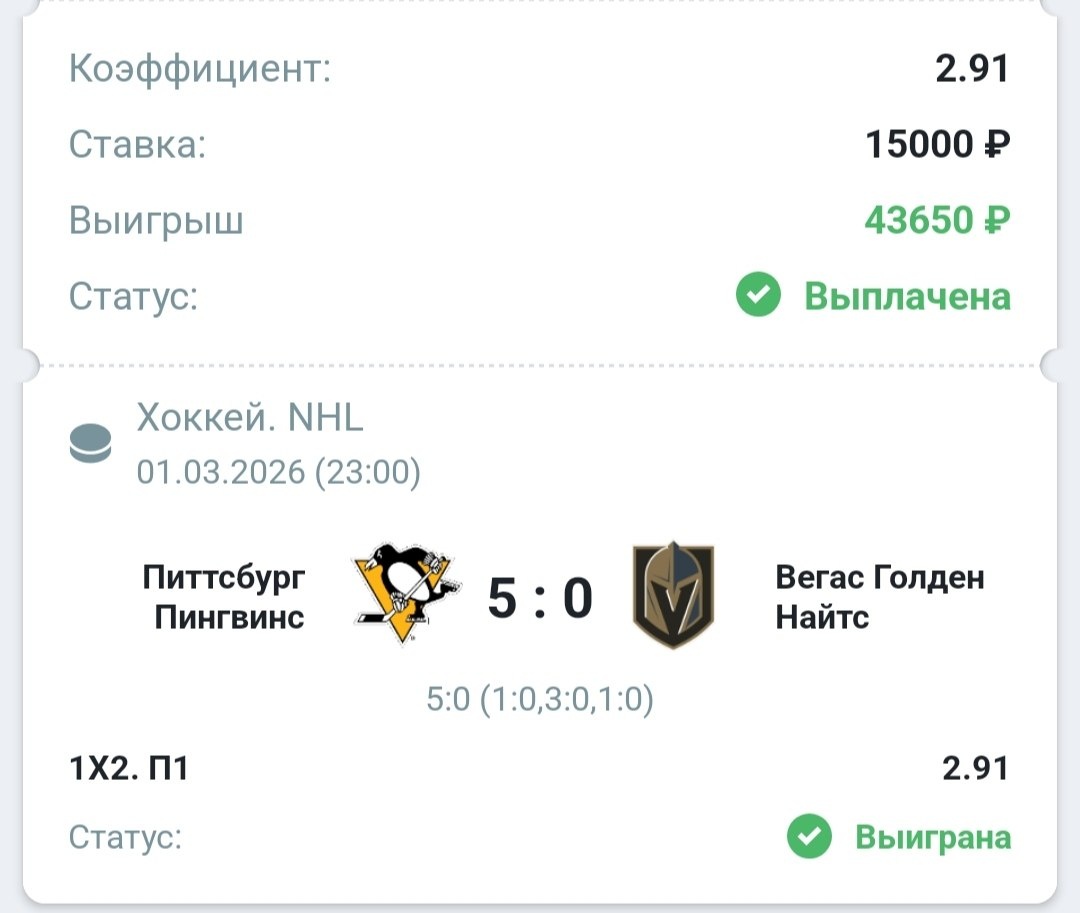Пингвины нас не разочаровали ✅✅✅✅ как и писал в випке они заберут этот матч. Не смотря что фавориты были Вегас Голден Найтс.