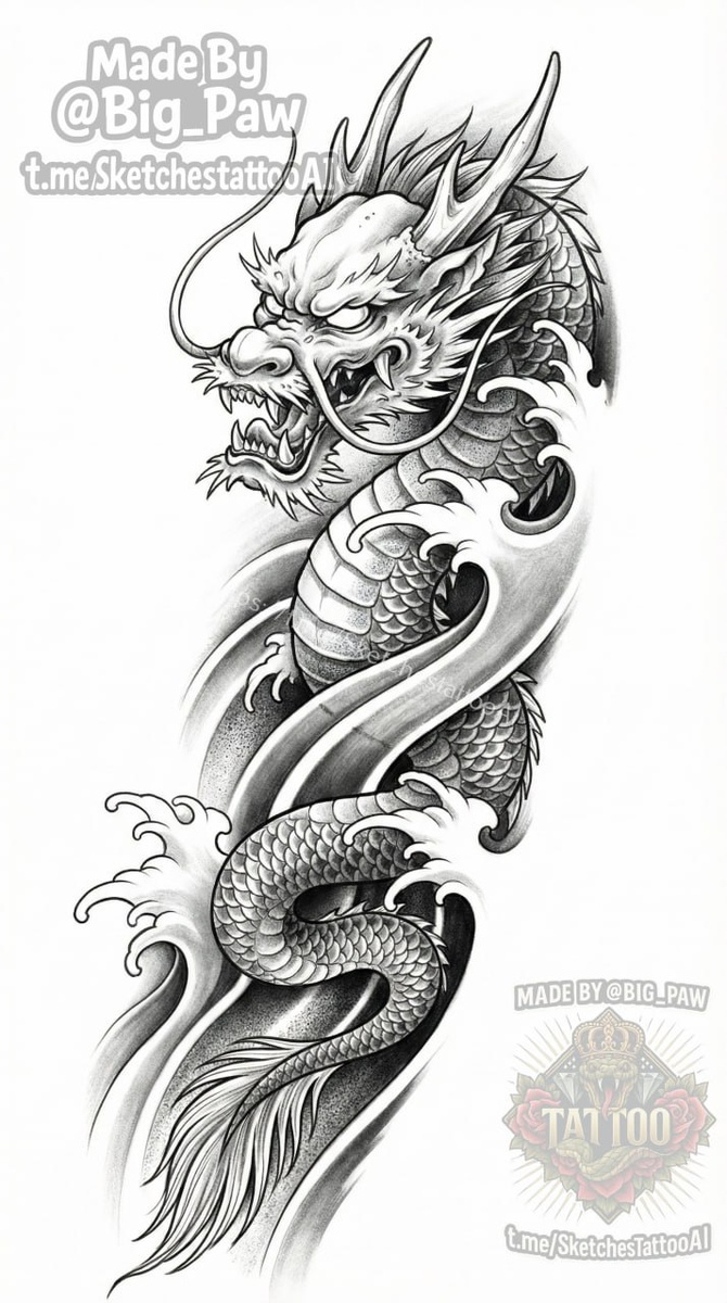 Идеальная морда для дракона есть, нужно что-то подобное, но с продолжением вниз для предплечья. Будет здорово, если что-то получится) стиль как на фото, работа планируется так же в чб. На фото с зеленым эскизом чисто как пример 🧠 SYNTX - тут создан эскиз 💎 Информация - все услуги 💀 Эскизы от нейросети 😎 Удалить тату - прайс #дракон #напредплечье #япония #эскиз #тату #татуировка