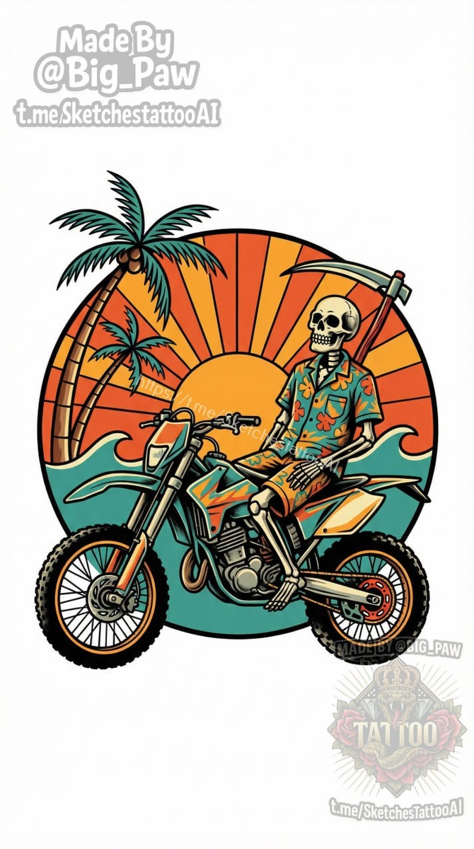 идеале цветную. Типа нюскул или олдскул. и такое только на мотоциклах эндуро ,в шёртах и гавайской рубашке, можно с косой за спиной 🧠 SYNTX - тут создан эскиз 💎 Информация - все услуги 💀 Эскизы от нейросети 😎 Удалить тату - прайс #скелет #принт #нюскул #эскиз #тату #татуировка