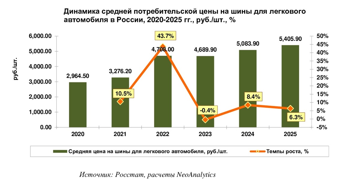 Объектом исследования являются средние цены на шины для легкового автомобиля новые зимние, летние, всесезонные, руб. за шт. В ходе ежемесячного мониторинга розничных (потребительских) цен на шины для легкового автомобиля, проведенного NeoAnalytics, выяснилось, что средняя потребительская цена в 2025 г. продемонстрировала рост в 6,3% относительно аналогичного показателя годом ранее и была зафиксирована на отметке в 5 405,9 руб./шт. Таким образом, цена на четыре колеса составит 21 623,6 руб. в среднем. Пик индексации средней цены пришелся на 2022 г. В тот год средние цены взлетели на 44%. Однако уже в последующий год произошла коррекция и средняя цена упала на 0,4% за год. В последующий 2024 г. динамика роста возобновилась. Таким образом, за последние шесть лет средняя цена выросла практически в два раза. Еще в 2020 г. одну шину в среднем можно было купить за 2 965 руб., в то время, как в 2025 г. она уже реализуется за 5 406 руб. Традиционный анализ помесячной динамики периода с января п