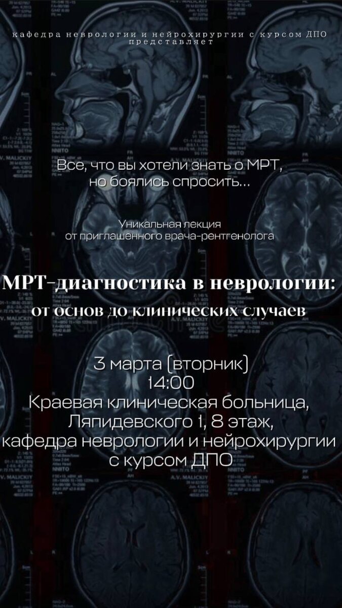 🧠🔍 Информация для обучающихся АГМУ, в том числе врачей ординаторов. Приглашаем вас на лекцию по магнитно-резонансной томографии (МРТ), которая состоится 3 марта в 14:00 на базе кафедры неврологии и нейрохирургии с курсом ДПО. 👨🏼⚕️Спикер: практикующий врач-рентгенолог (МРТ). В программе: - Основные принципы МРТ-диагностики - Особенности проведения исследований в неврологии (инсульты, демиелинизирующие заболевания, опухоли и др.) - Разбор клинических случаев - Ответы на ваши вопросы 📚Лекция будет полезна студентам, ординаторам 1-го и 2-го года обучения, а также всем, кто интересуется современными методами нейровизуализации. 💬Готовьте вопросы! Ждём вас для углублённого изучения темы и профессионального обсуждения. 📅 3 марта, вторник 🕐 14:00 📍Краевая клиническая больница, Ляпидевского 1, 8 этаж, кафедра неврологии и нейрохирургии с курсом ДПО