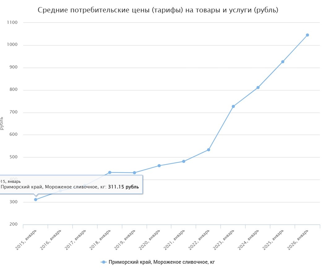 Мороженое за 10 лет выросло в цене в три раза в Приморье — с 311 рублей за кило до 1100 рублей, по данным федеральной статистики